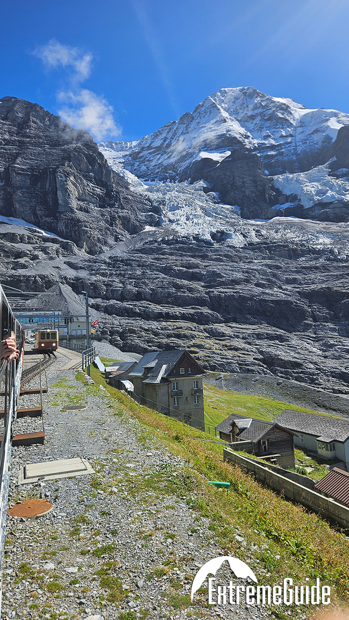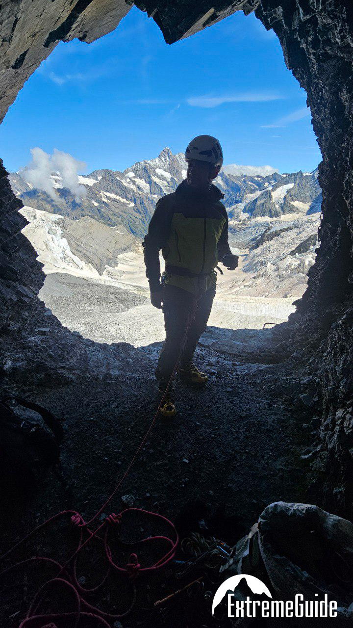 Маршрут підйому на притулок починається в залізничному тонеллі, на висоті 3000 м. Потяг іде від села Гріндельвальд в гору , до висоти 3600 м., станціїї Jungfrau. Із тонеля ми дюльфернули 20 м по скелях на льодовик , і далі по льодовику вийшли на скелі по яких піднялись до притулку.