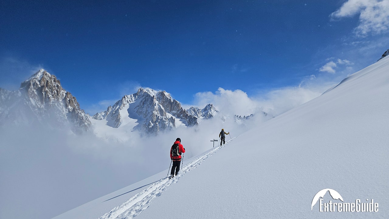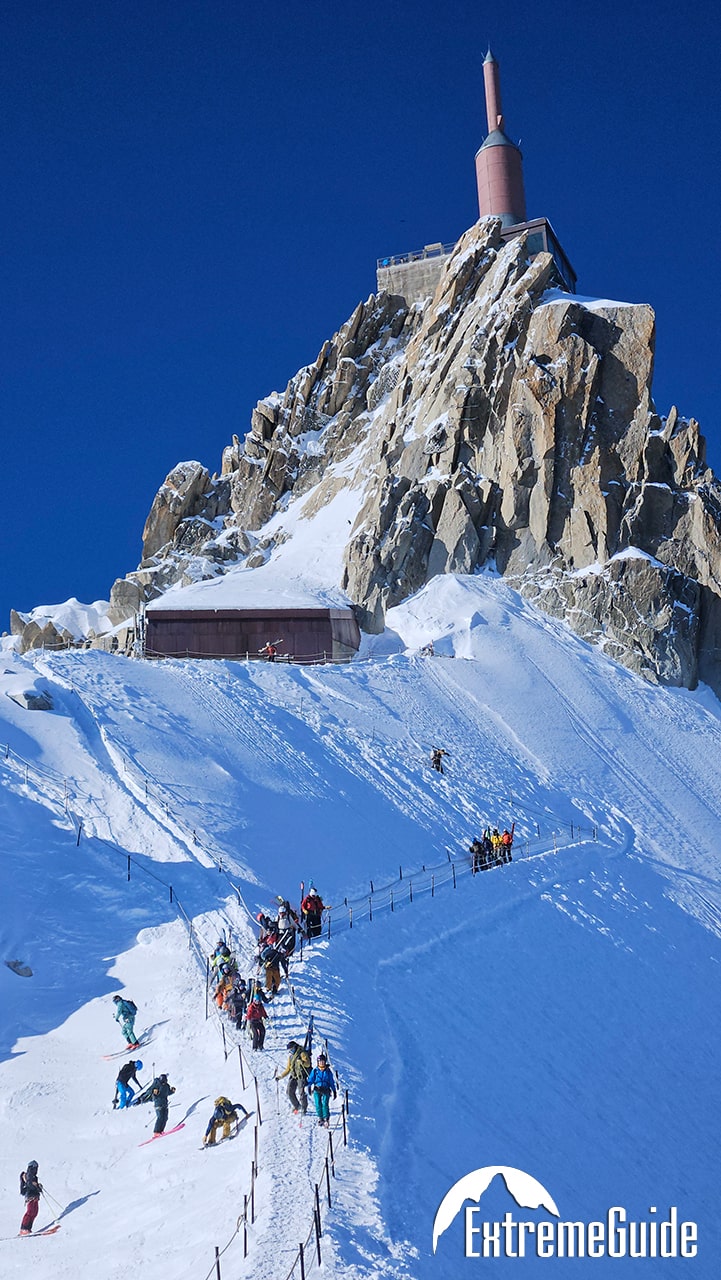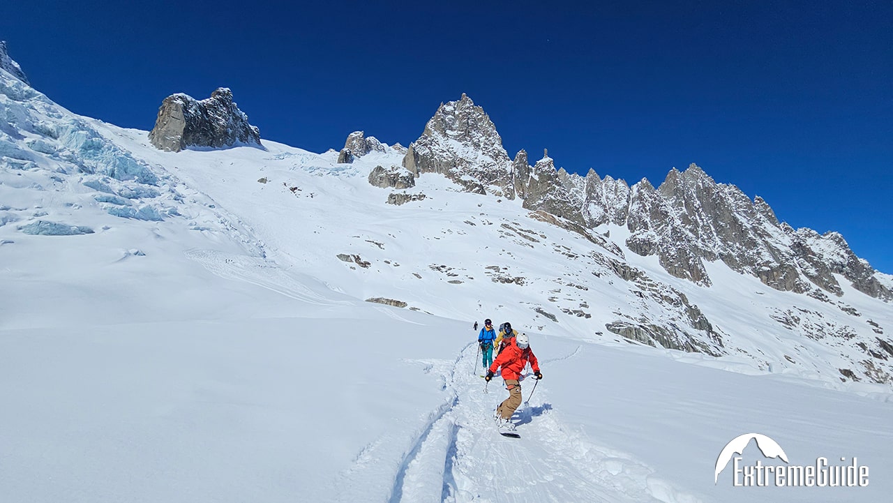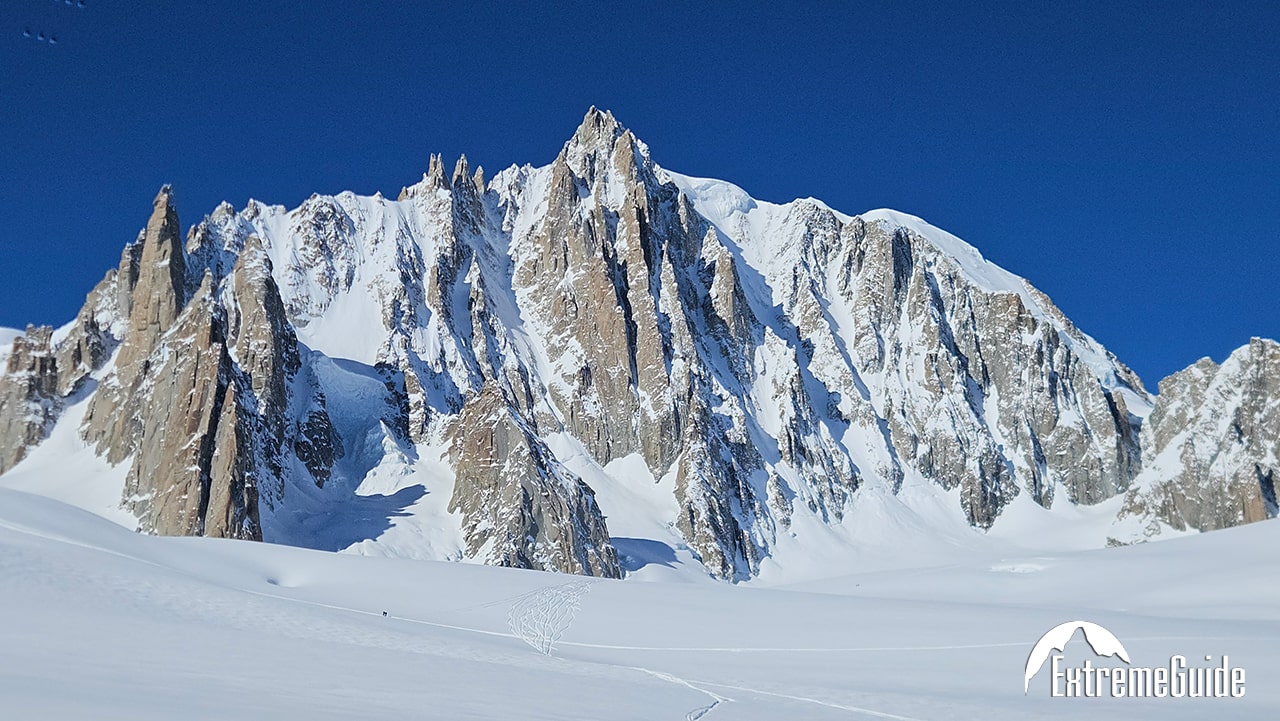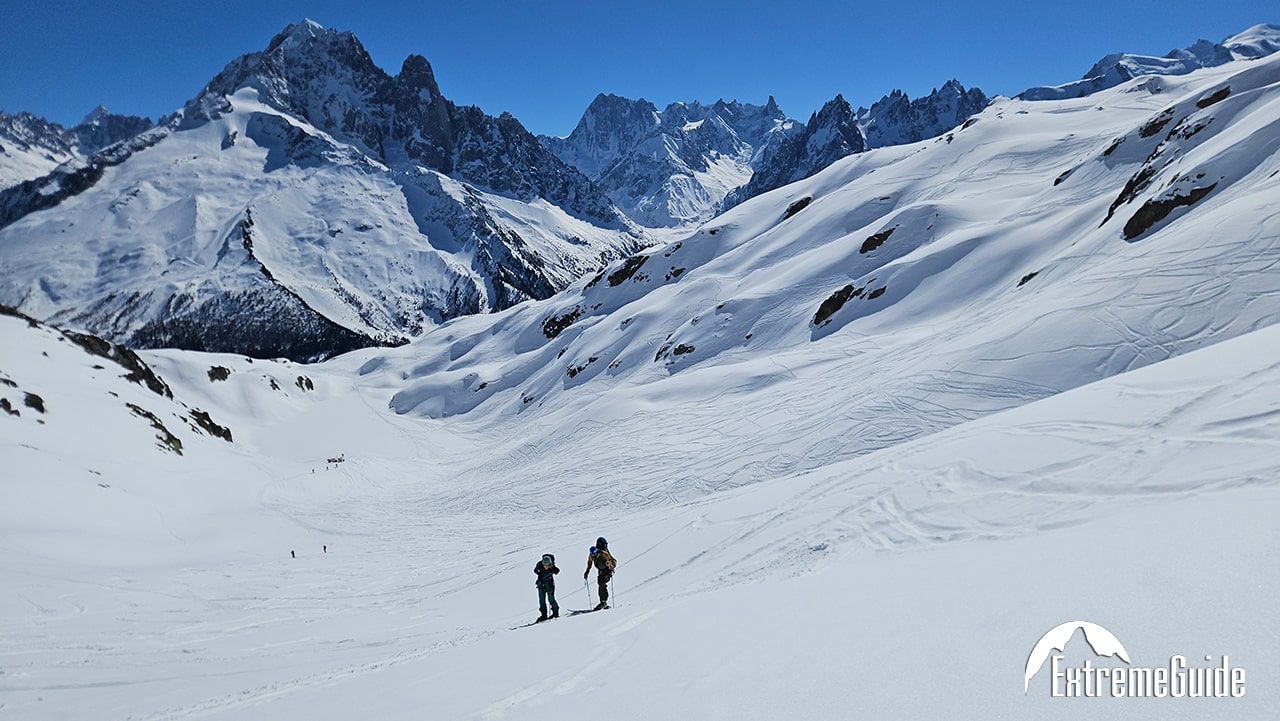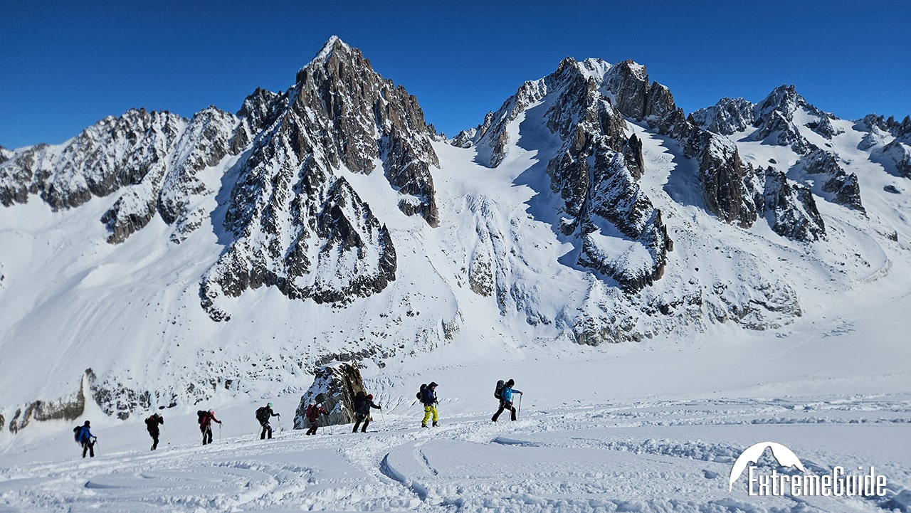 Головний день усієї поїздки. Вихід із апартаментів о 7:30. Підйом на двох чергах канатної дороги на вершину Агюйді Міді на висоту 3842 м. Короткий перехід по сніговому гребеню в кішках зі страховкою на мотузці і далі спуск на лижах по Валь Бланш (Біла Долина) через льодовики Жен, Такуль і Мар де Гляс до станції Монтенвер . На середині спуску після всіх труднощів можна зробити зупинку для відпочинку та перекусу з чудовим видом на льодопад Серакс дю Жен або відвідати гірську хижину Рекан, де можна пообідати. Якщо снігові умови дозволяють, можна спуститися до самого Шамоні на лижах. Якщо ні, то для повернення в долину доведеться скористатися витягом та високогірним трамваєм. Залежно від погодних умов та рівня підготовки групи спуск разом із підйомом у середньому займає 5-6 годин.