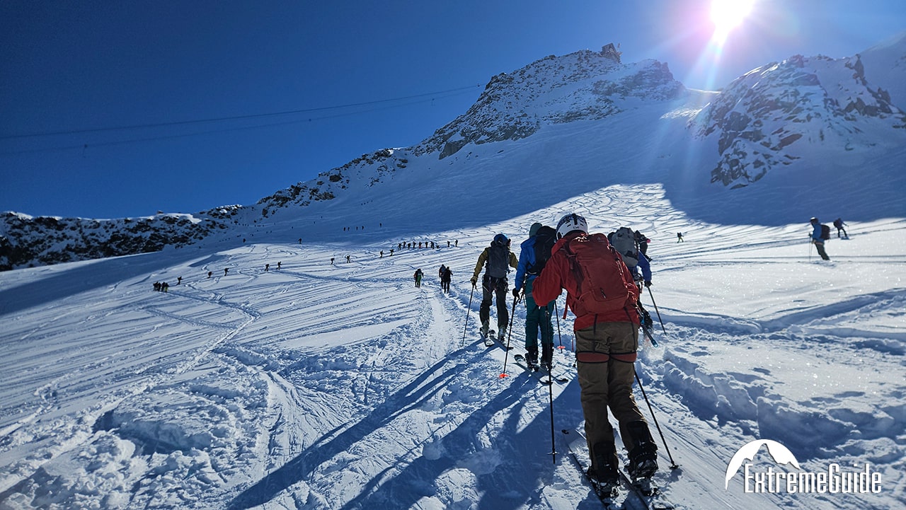 Вихід до 8:00 ранку (залежить від розкладу скі-басу). Поїздка до села Аржентьєр (1252 м). Підйом на маятниковій дорозі на вершину Гран Монте, висота 3296 м. Фрірайд льодовиками Логнан і Пендан. Увечері о 19:00 підготовка спорядження до скі-туру (одна година).