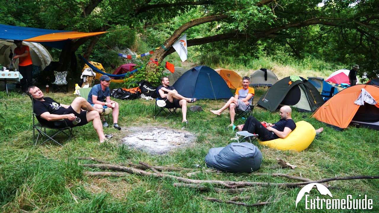 Базове розміщення в наметах на березі річки, за бажанням, є можливість жити в будинку (садиба, необхідно бронювати).