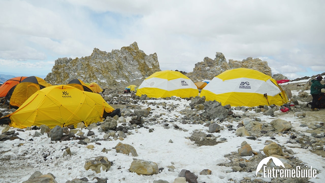 Набираємось сил до обіду. Після переходу на 5000 метрів до Канади. Шлях займає близько 2,5-3 годин. Встановлюємо намети. Звідси відкривається шикарний вид на захід сонця, і ми його спостерігатимемо. У засуху в таборі проблема з водою, тож можливо буде необхідність принести воду з Плази Мулас. Час у дорозі 3 години, 3 км. Набір висот 800 м.