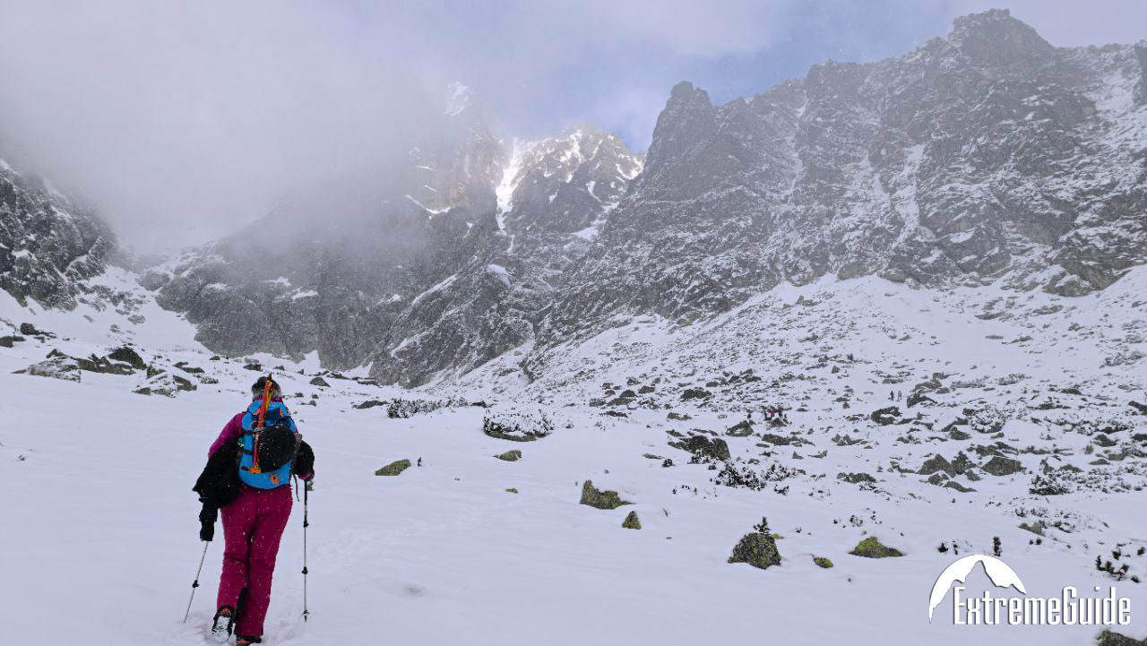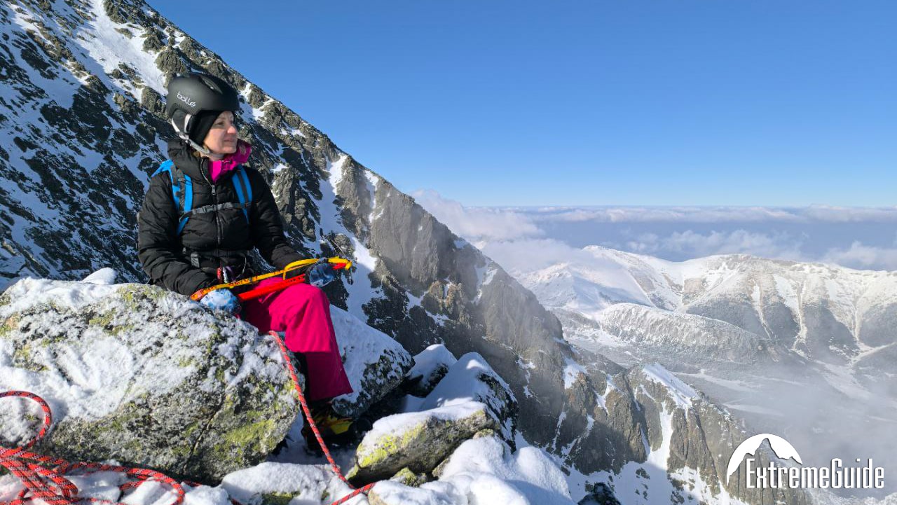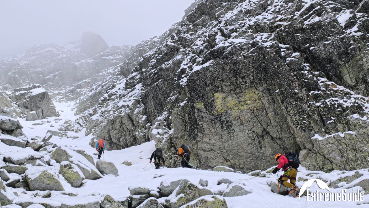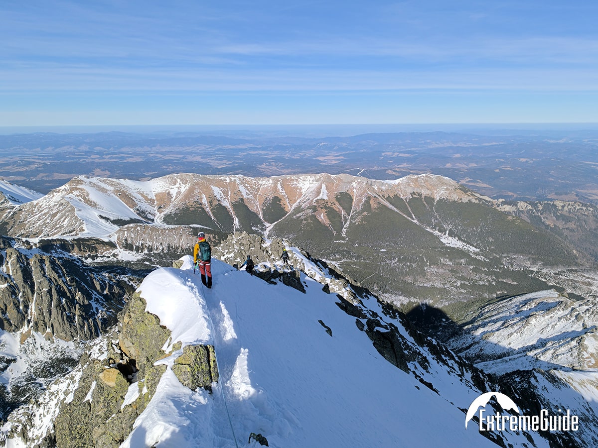 Зранку доїджаємо канаткою до станції Скальнате плесо, звідти година підходу до старту маршруту. Складність маршруту 2А (PD-). Гарний маршрут для тренування навичок пересування по снігу. Підйом по крутому сніжному кулуару, вихід на гребінь, рух до вершини по скельному гребеню.