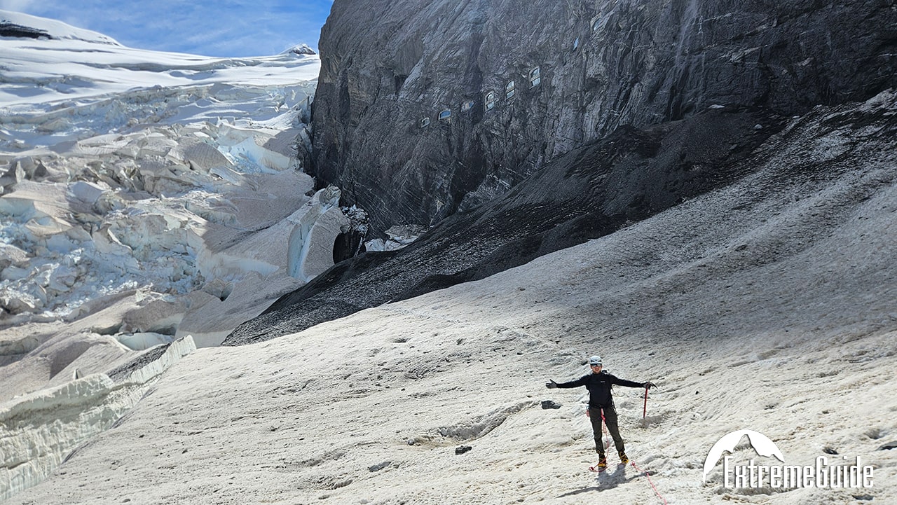 Ранній підйом. Ще у темряві виходимо на маршрут, який починається буквально від хатини. На світанку починається і технічна частина сходження. На найскладніших ділянках закріплені перильні мотузки.