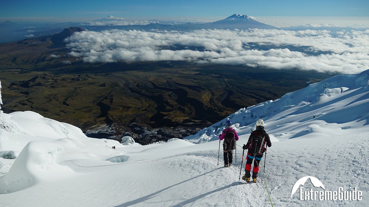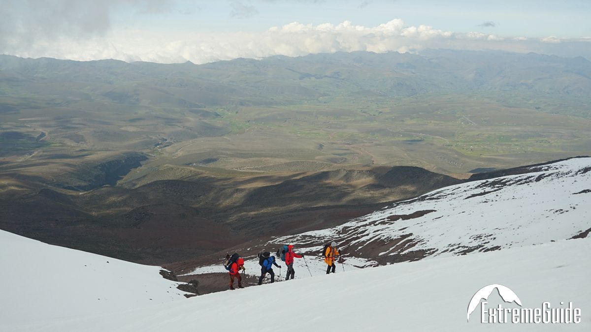 З висоти відкривається панорама вулканів Еквадору. Спуск тривалістю 4-6 годин у притулок Ерманес Карел (4800 м) до авто.